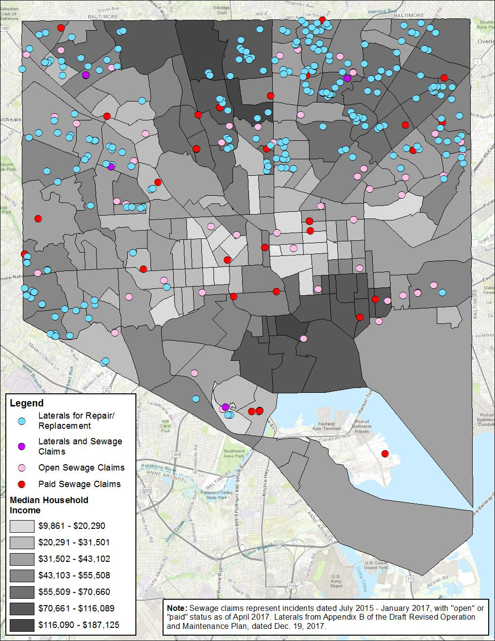 The Operations and Management Plan has already been published (PDF), and it includes one piece of the City's plan to address building back-ups of sewage: its program for finding, prioritizing, and repairing broken or leaking lateral sewage lines (the pipes carrying sewage from homes to the sewer main lines under the streets) that cause building back-ups. According to an analysis by the Environmental Integrity Project, the process the City plans to use to find laterals that cause building back-ups may fail to find laterals that contribute to back-ups in low-income neighborhoods. 48% of claims for damage from basement back-ups submitted to the City Law Department from July 2015 through February 2017 were for buildings in census tracts with an average household income of less than $42,000. However, only 27% of laterals causing back-ups identified through City's program are in those neighborhoods. (The map above illustrates this pattern: although the pink and red dots indicate that sewage back-ups in buildings occur throughout the city, laterals marked for replacement and repair by blue dots are clustered to the north and west.) We're working with the Environmental Integrity Project to make sure the city doesn't overlook sewage problems in low-income communities and prioritizes those needs in future plans. You can read more details and recommendations in our comments to DPW here: