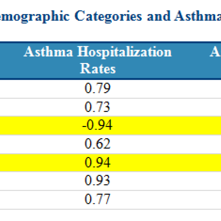 EIP analyzed the correlation between extreme asthma events in Baltimore and seven demographic markers of poverty. Table 5, copied below, shows the correlation between each demographic category and asthma rates. Correlation coefficients are interpreted as showing stronger correlation the closer that they are to -1 or 1, and weaker correlation the closer that they are to 0.