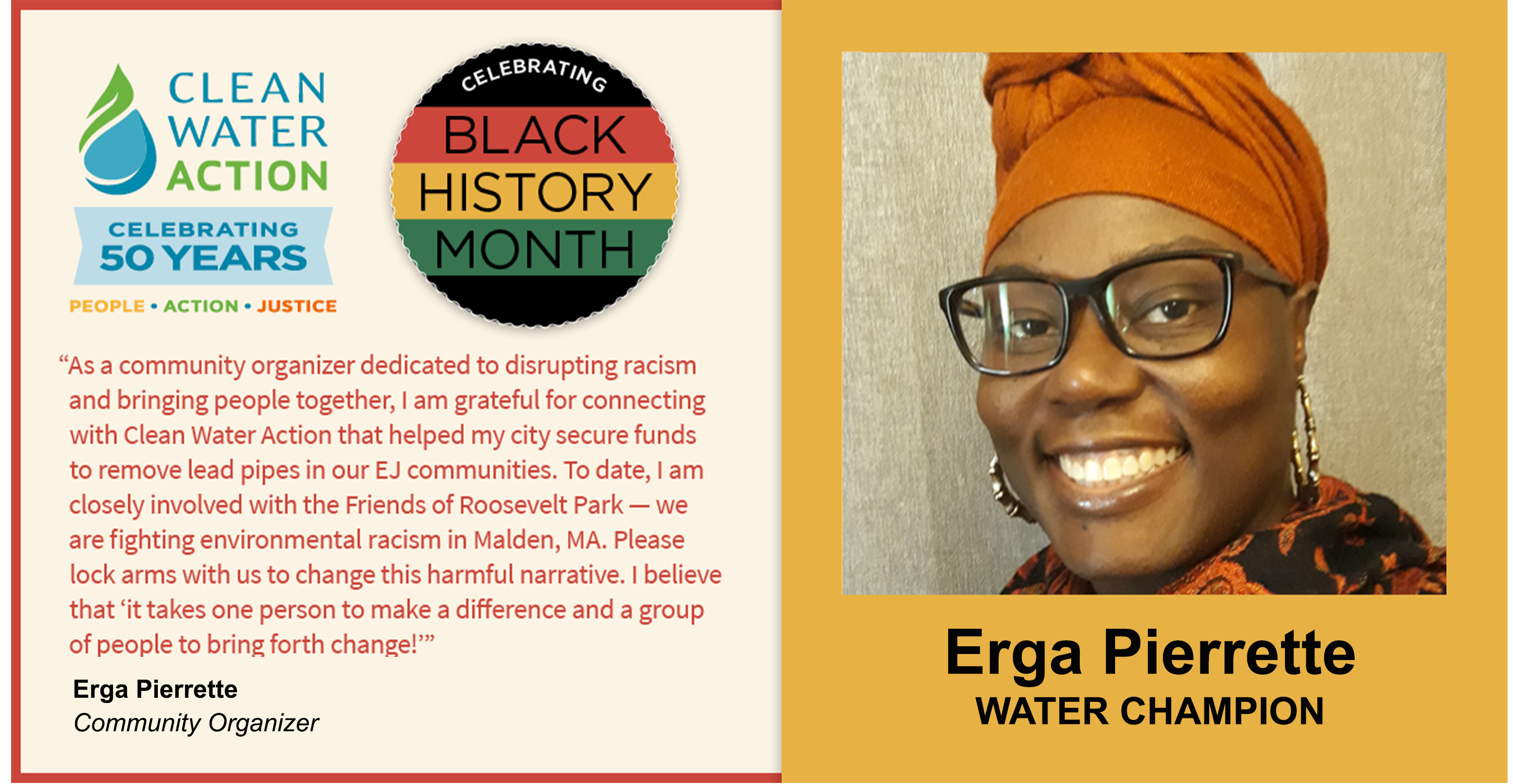We are excited to recognize and uplift Black Water Champions internally and externally throughout Black History month at Clean Water Action. During this time of reflection on important advancements and milestones in history, we honor those who sacrificed and impacted the Black movement for justice and equality, as well as Black leaders of today.